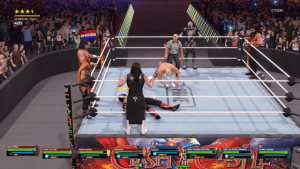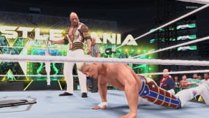 Character detail is incredible, from the beads of sweat on Roman Reigns’ brow to the complex face paint of Superstars like Asuka. Cloth physics on ring gear look more natural, mud and dust effects on arenas have been improved, and everything pops with high-end polish.