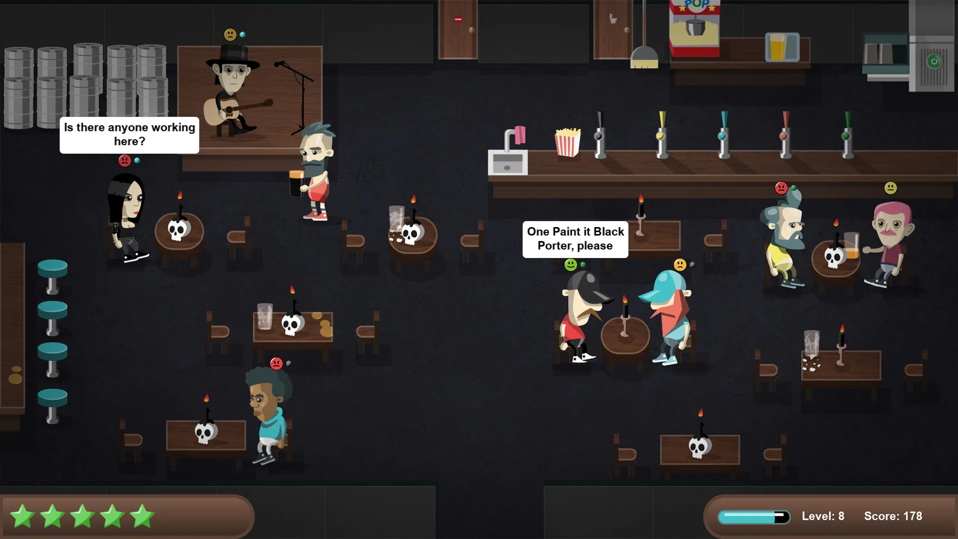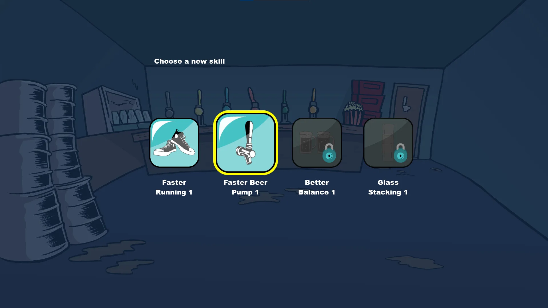 If this isn’t enough, you’ll have to serve water to drunk clients, popcorn to keep people happy, and wash glasses at an ungodly rate. Though this sounds menacing and unfair, there is a character progression system to help you out. Run faster, collect more glasses, pour your drinks quicker, and increase your balance. These abilities help you to fly through the levels and keep the beer flowing.