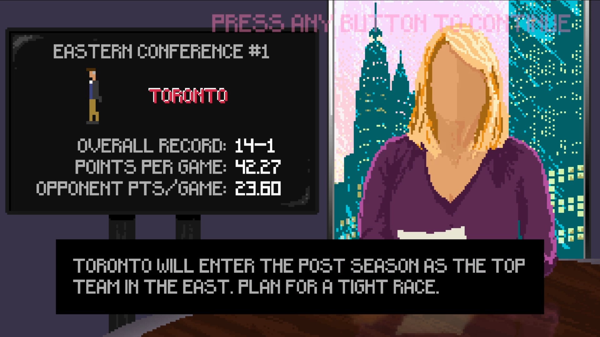 Basketball Classics reeks of style. The game looks great; especially if you’re looking for that classic old school style of gaming. Each team has its own color palette, players have a simplistic yet blocky presentation. Additionally, players, hosts and half time performers (that appear for a brief moment) are all faceless. Why coming off creepy, it adds a layer of realism so to speak; as much as possible in a 16 bit game. The movements in the 1v1 dunk confrontation is also quite solid. On the audio side of things, nothing to report. There’s no real voiceover to keep the old school presentation.
