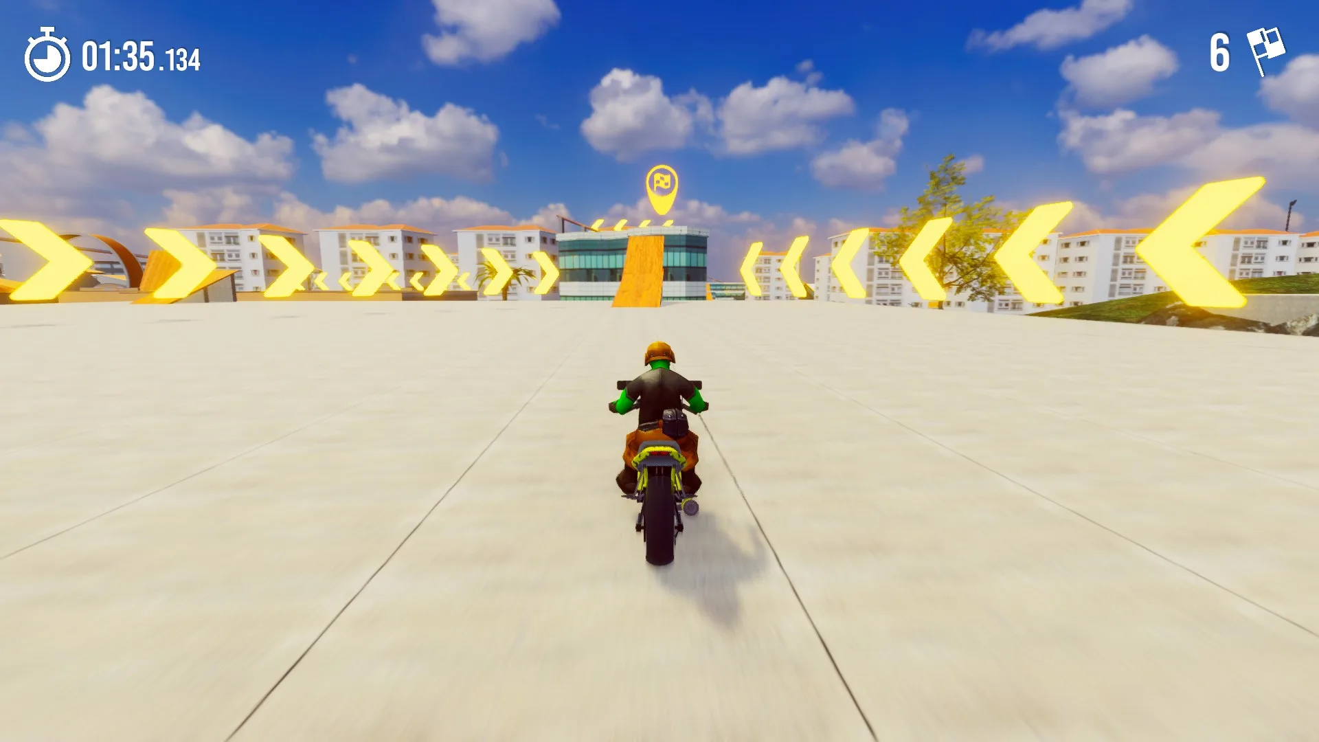 As with any racer, you can accelerate, brake and use a handbrake for those sharp turns. And that’s it. Can’t pull any tricks; just ride, follow the arrows and hit each checkpoint. You can also unlock two more bikes, by earning money, which you’d expect to earn by completing the levels. But you don’t.